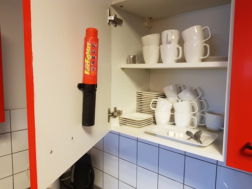 SPITA FireFighter aan deur van keukenkast bevestigd met de speciale klem.